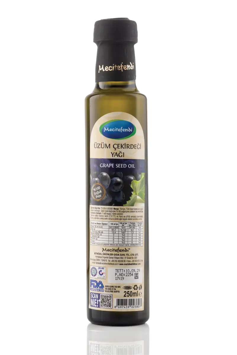 Üzüm Çekirdeüği Yağı, %100 soğuk pres yöntemiyle üretilmiş olup, üretim süreci boyunca filtrasyon sürecinden geçirilen yağ, yüksek kalite standartlarına uygun olarak hazırlanır.
